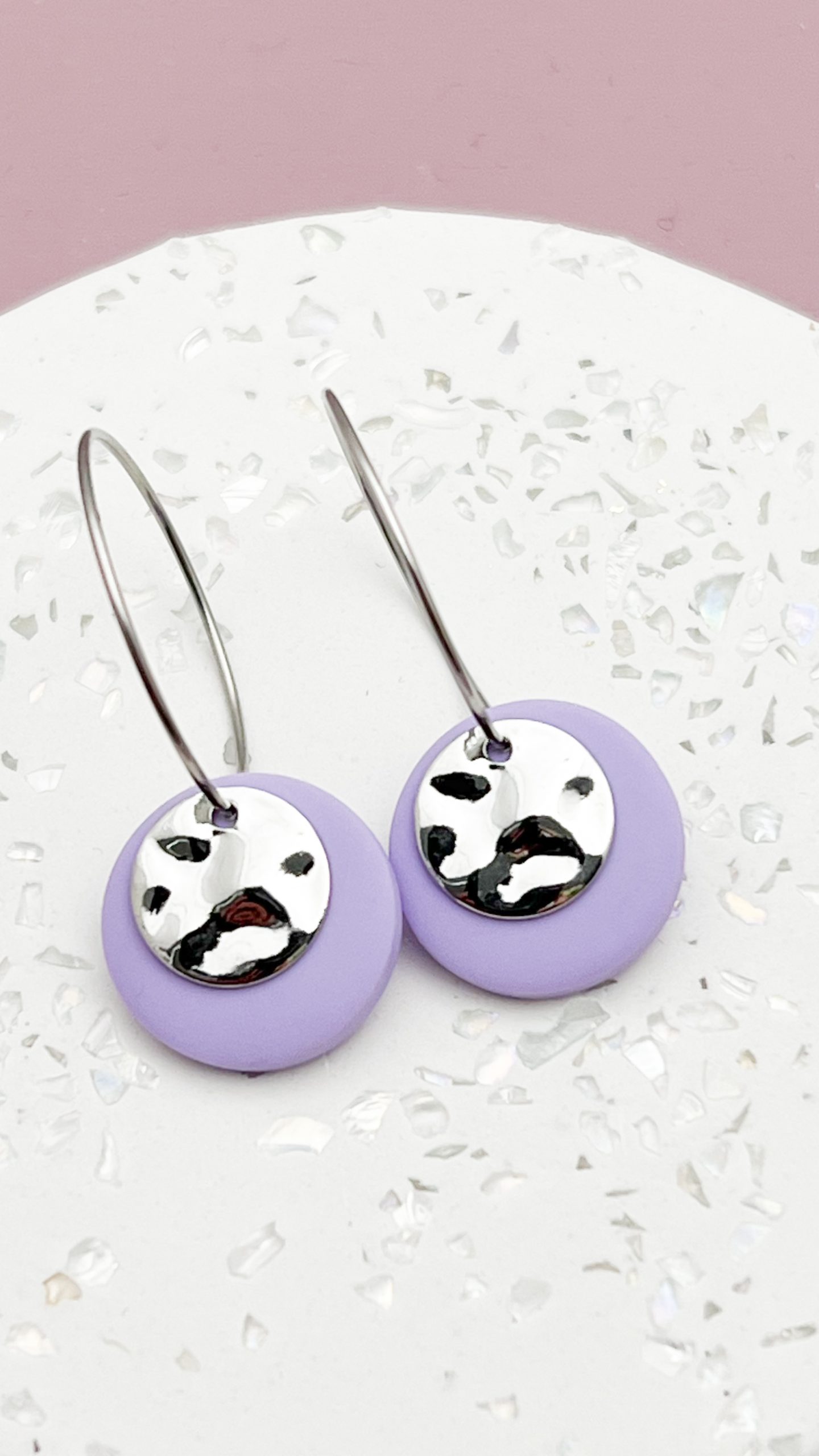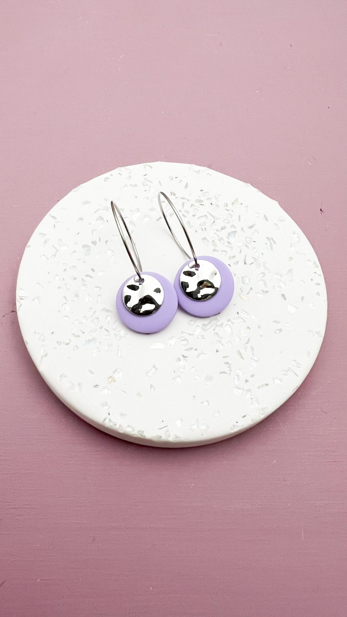Silberfarbene Creole aus Edelstahl (gut verträglich auch bei empfindlicher Haut). Das runde  Plättchen in Lavendel  ist aus Polymer Clay (einer ofenhärtenden Modelliermasse), das darauf liegende gewellte runde Schmuckplättchen ist versilbert. Der Ohrring ist sehr leicht und angenehm zu tragen.