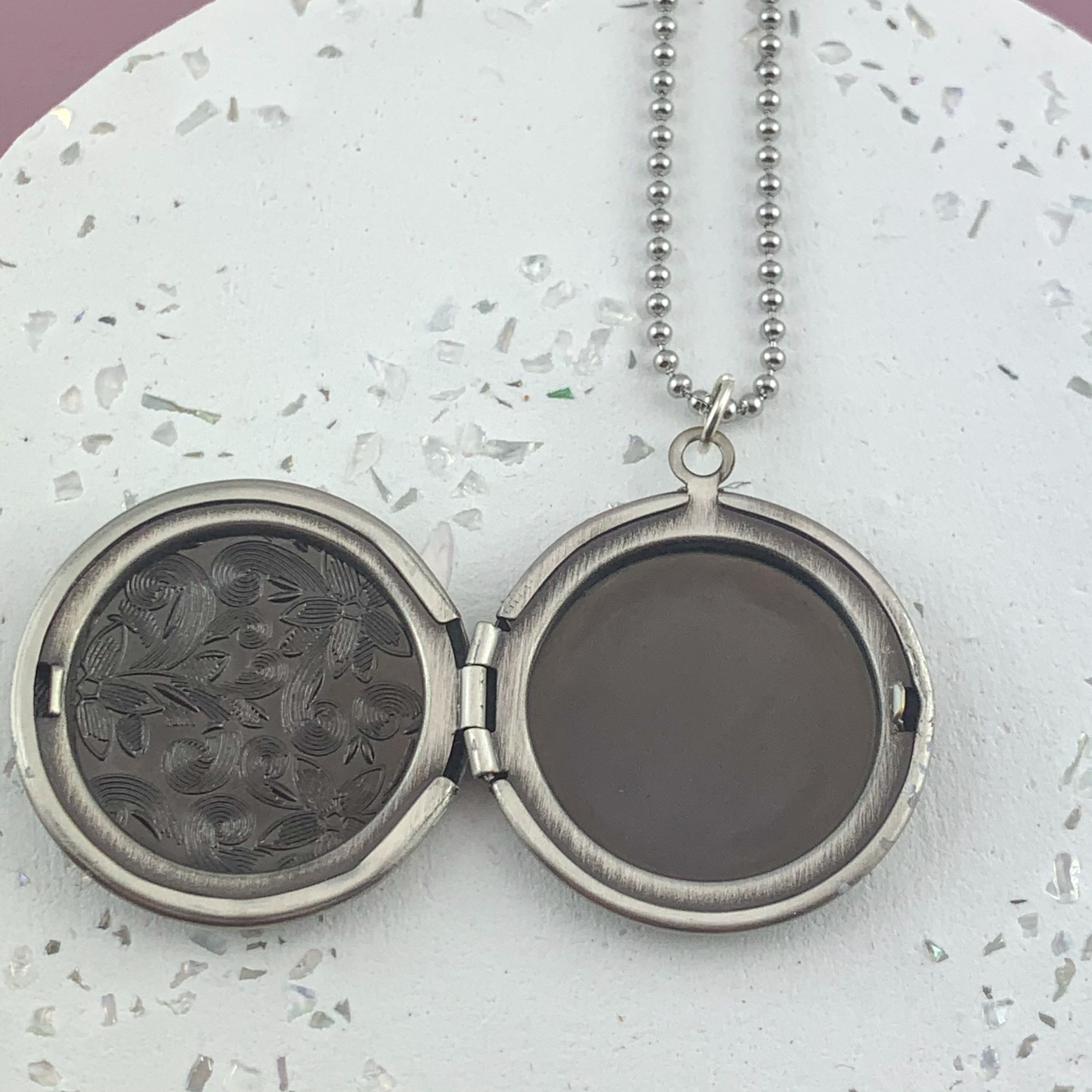 Fotomedaillon mit eingraviertem floralem Muster im Vintage-Stil. Die Gravur wird durch eine helle Patina hervorgehoben. Das Medaillon bietet Platz für bis zu zwei Fotos. Eine Vorlage zum einfachen Zuschneiden liegt bei. Die Rückseite des Medaillons ist glatt. Es hängt an einer langen Edelstahl-Kugelkette, die auch bei empfindlicher Haut sehr gut verträglich ist.