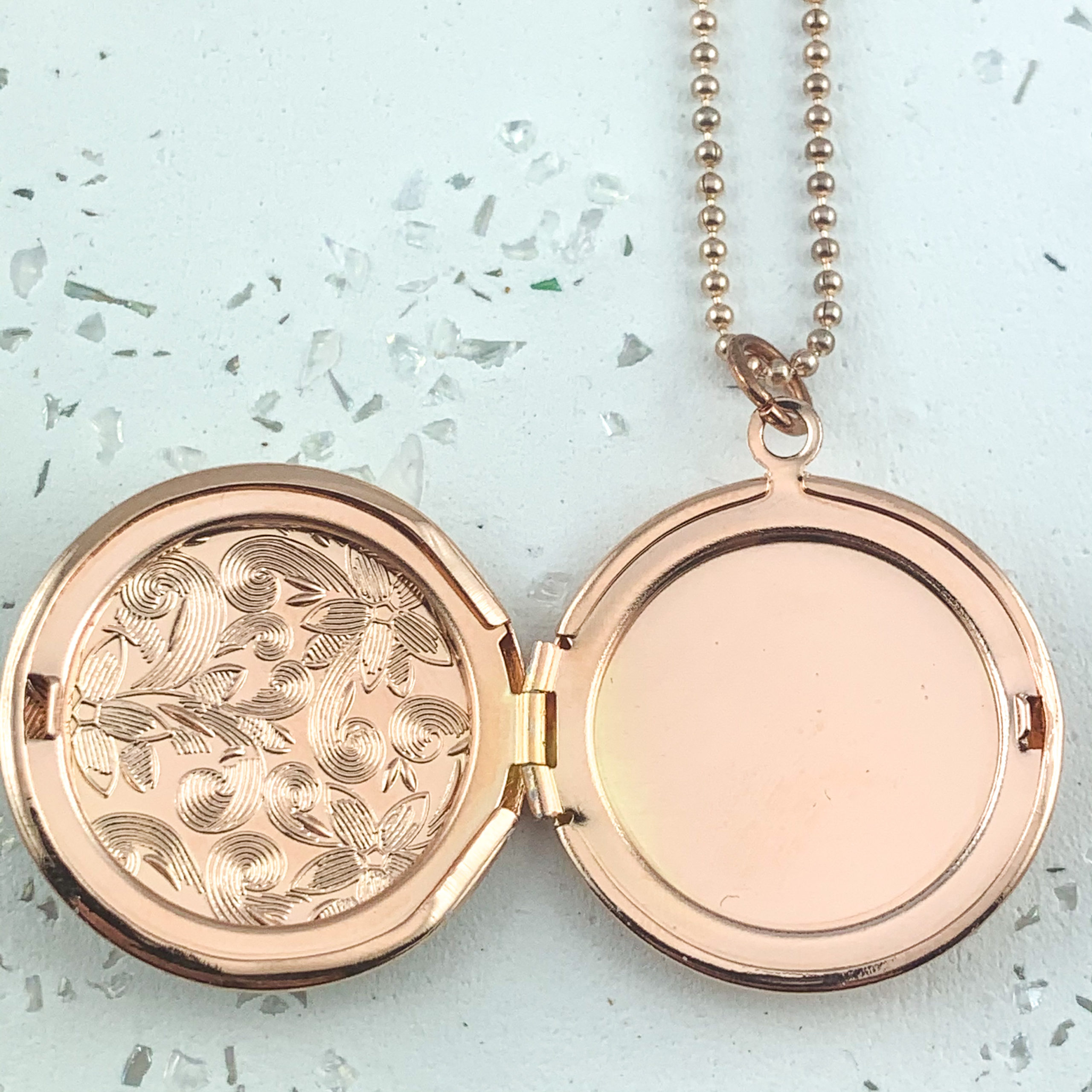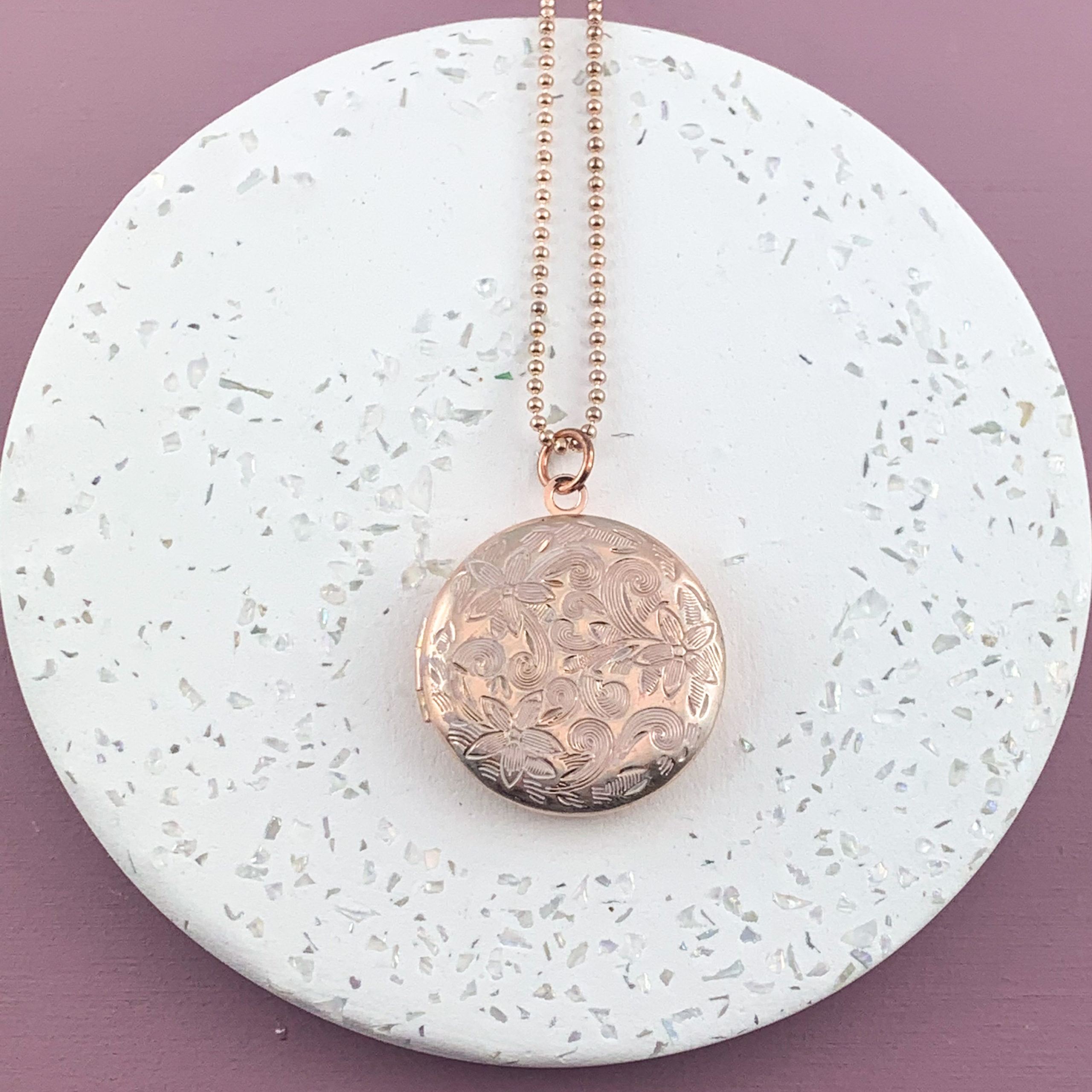 Fotomedaillon mit eingraviertem floralem Muster im Vintage-Stil. Die Gravur wird durch eine helle Patina hervorgehoben. Das Medaillon bietet Platz für bis zu zwei Fotos. Eine Vorlage zum einfachen Zuschneiden liegt bei. Die Rückseite des Medaillons ist glatt. Es hängt an einer langen roségoldfarbenen Kugelkette.