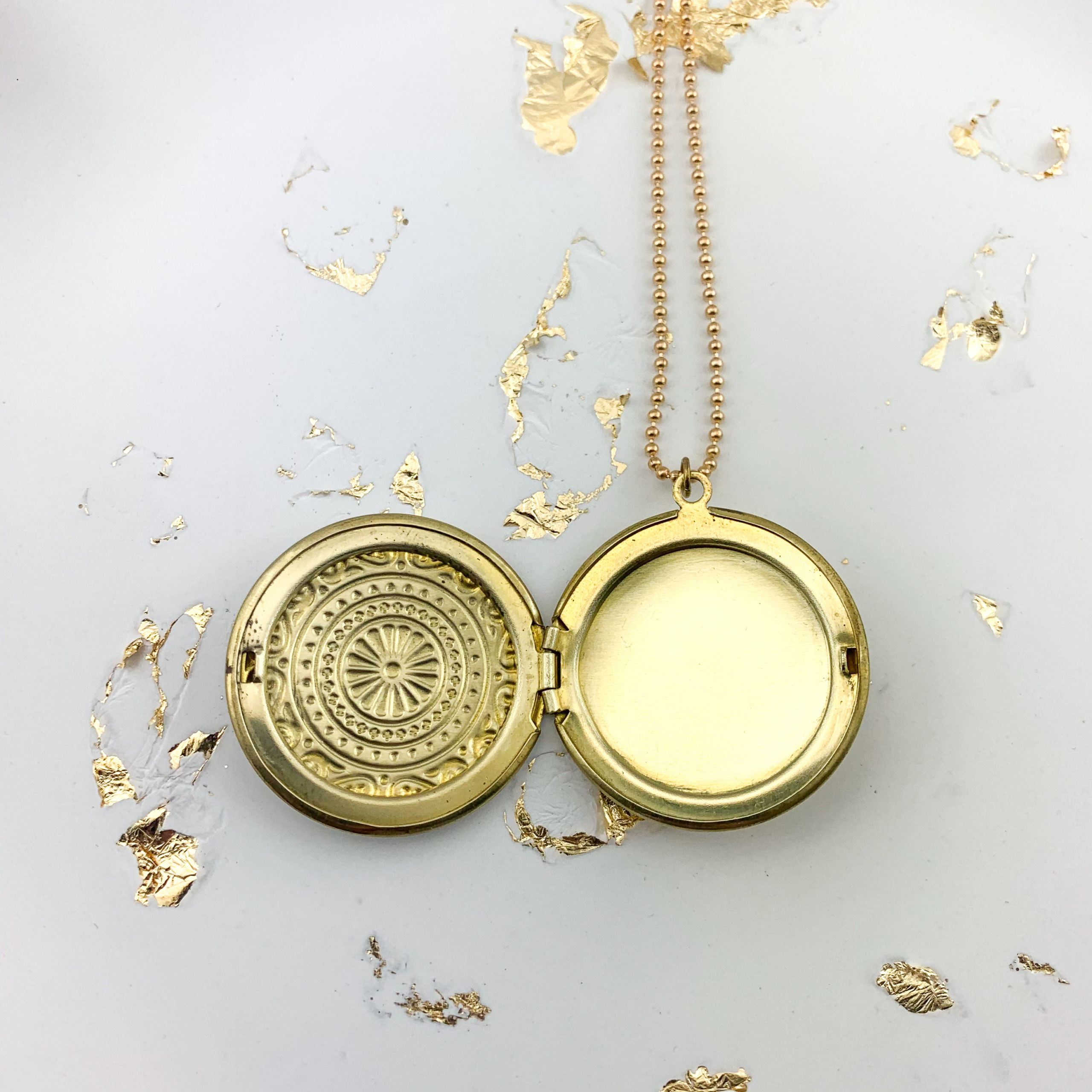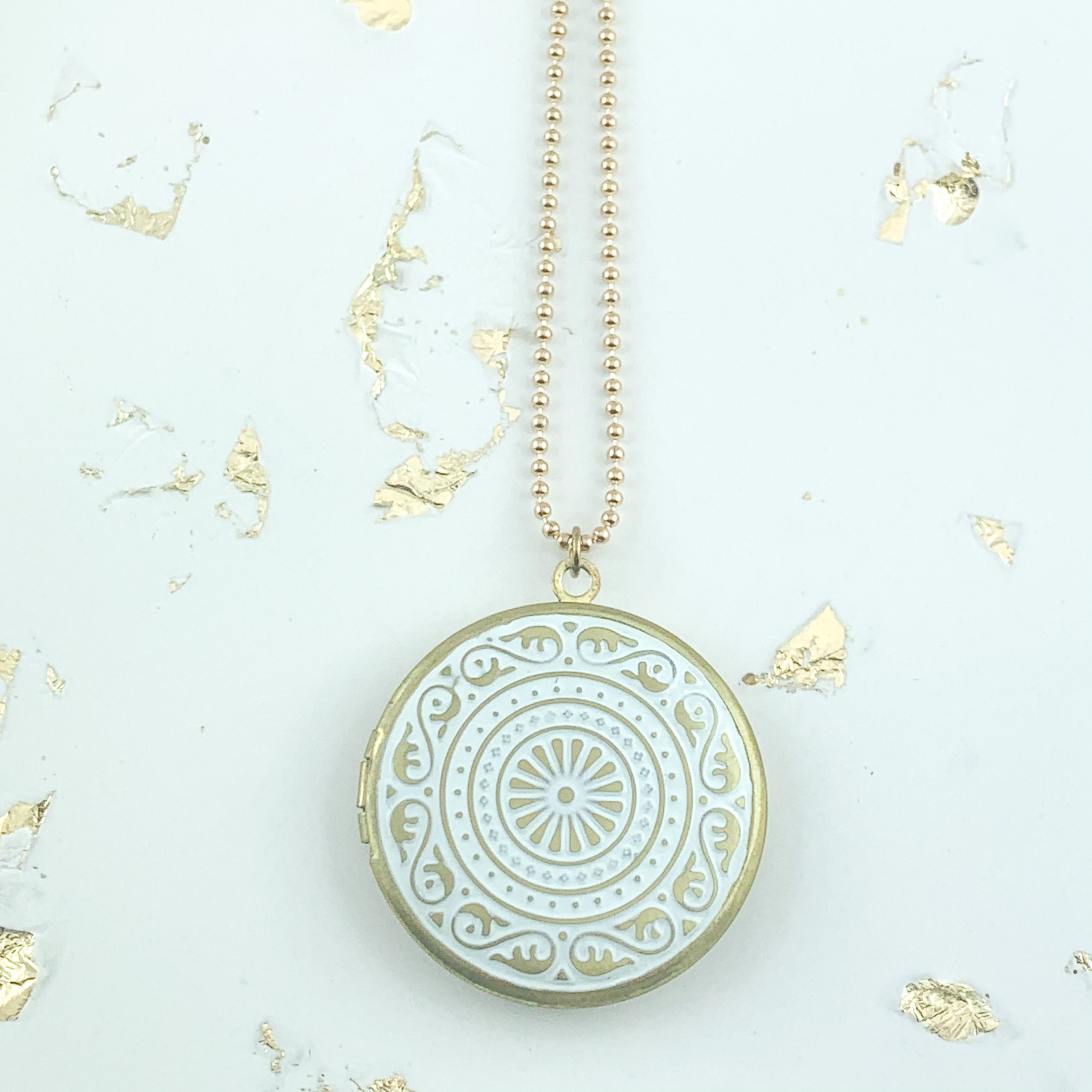 Fotomedaillon mit geprägtem Mandala-Muster im Vintage-Stil. Die Prägung wird durch die weiße Patina hervorgehoben.Das Medaillon bietet Platz für bis zu zwei Fotos. Eine Vorlage zum einfachen Zuschneiden liegt bei.
