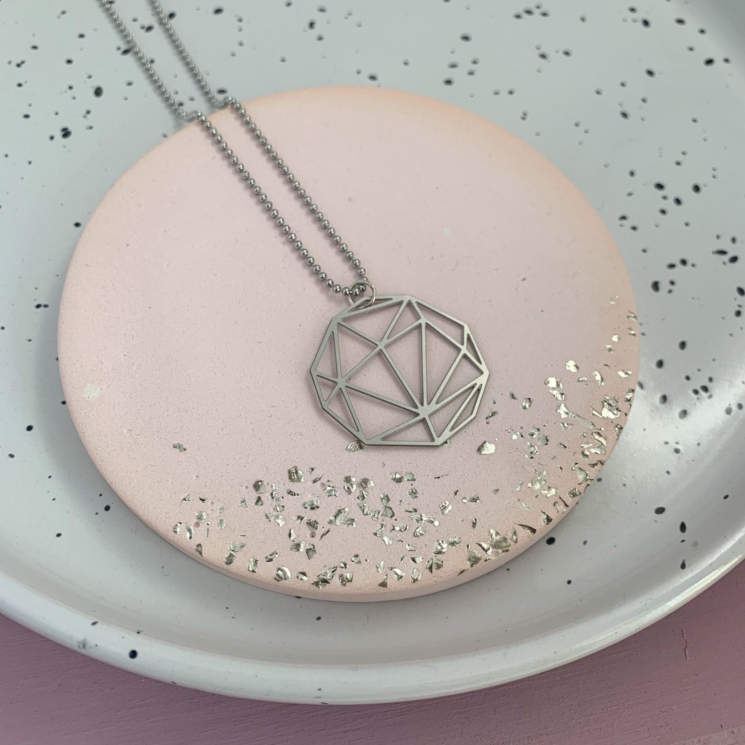 Das geometrische Hexagon ist aus Edelstahl, ebenso wie die Kugelkette und somit auch bei empfindlicher Haut angenehm, zu tragen. Die Kette hat keinen Verschluss, da sie so lang ist, das sie über den Kopf gezogen werden kann.