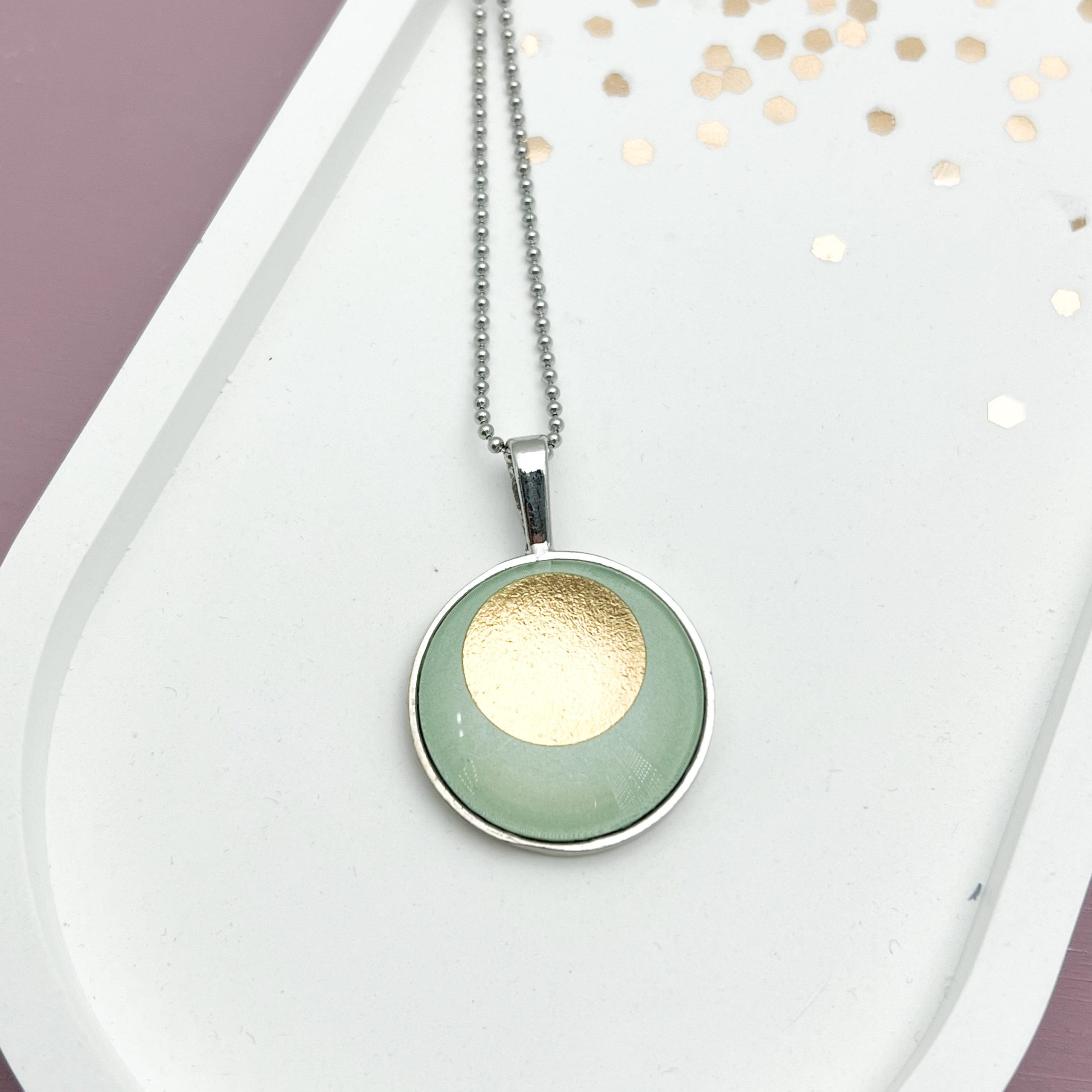 Glasanhänger in einem schönen Mint-Ton mit einem großen goldenen Punkt an langer silberfarbener Kugelkette aus Edelstahl.