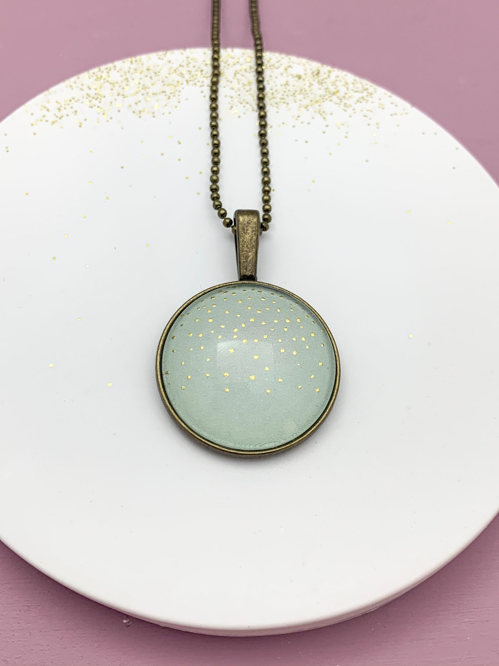 Glasanhänger in einem zarten Mint-Ton mit kleinen goldenen Pünktchen an langer bronzefarbener Kugelkette.
