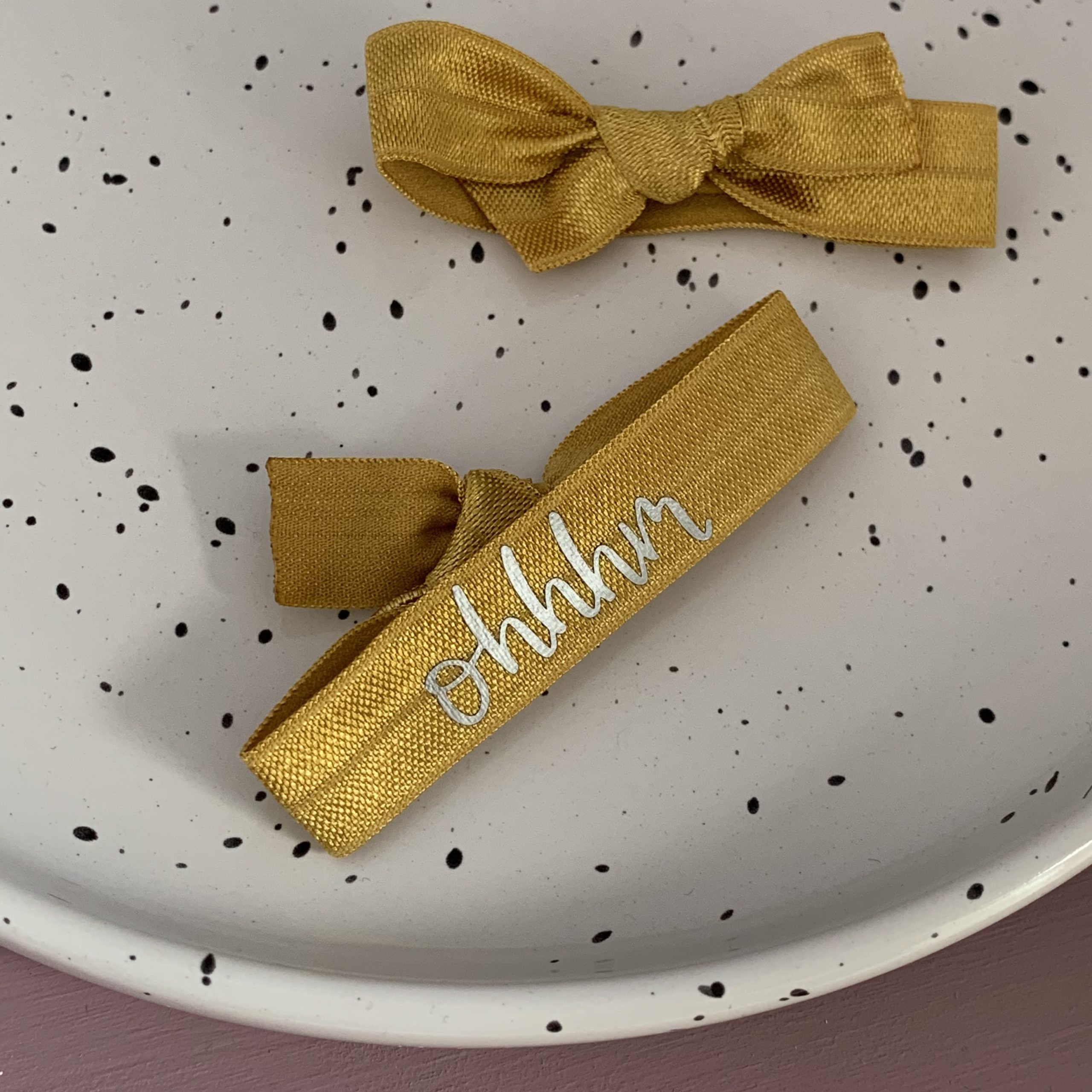 Von mir selbst geletteter Ohhhm-Schriftzug auf einem elastischen Armband. Das Armband ist auf der Rückseite geknotet und ähnelt einem Festival-Bändchen. Es kann auch als Haargummi getragen werden.