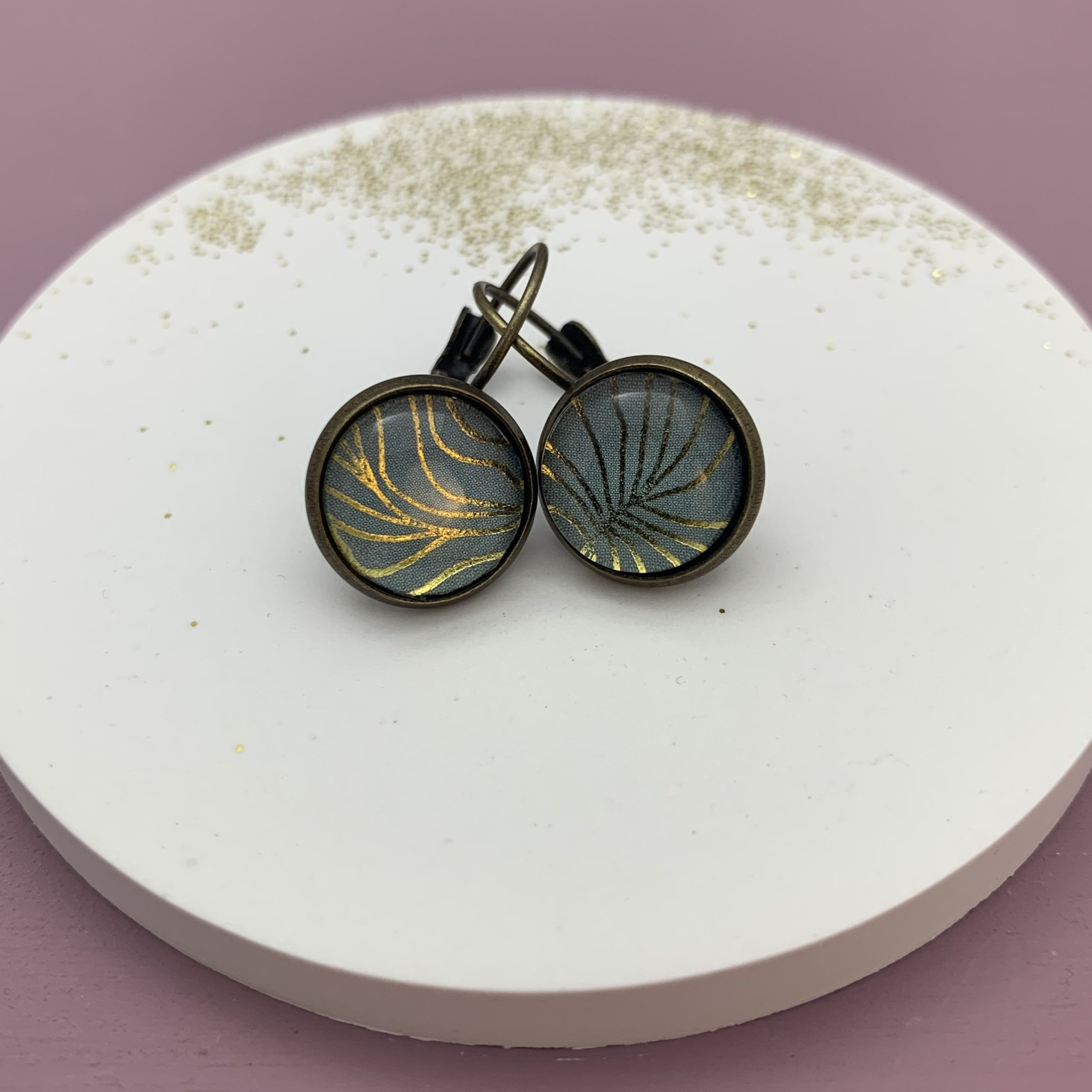 Glasohrhänger in blaugrau mit goldenem, fließendem Linienmuster.