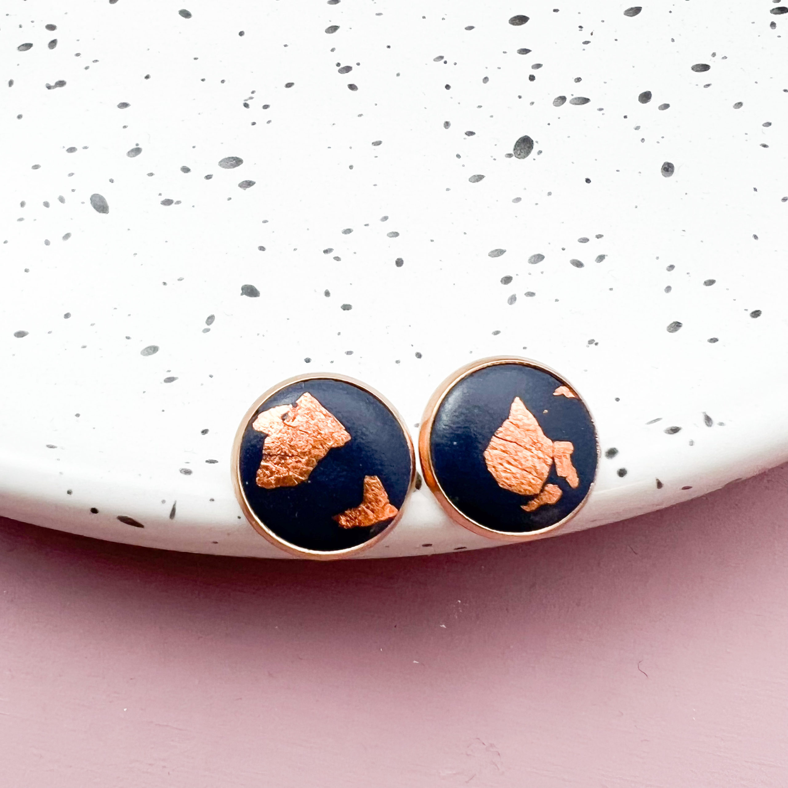 Ohrstecker in dunklem Petrol mit kupferfarbenen Akzenten. Die roségoldene Fassung ist aus Edelstahl und somit auch bei empfindlicher Haut gut verträglich. Das Dekor ist aus Polymer Clay (einer ofenhärtenden Modelliermasse), lackiert mit einem matten Finish. Der Ohrstecker ist sehr leicht und angenehm zu tragen.