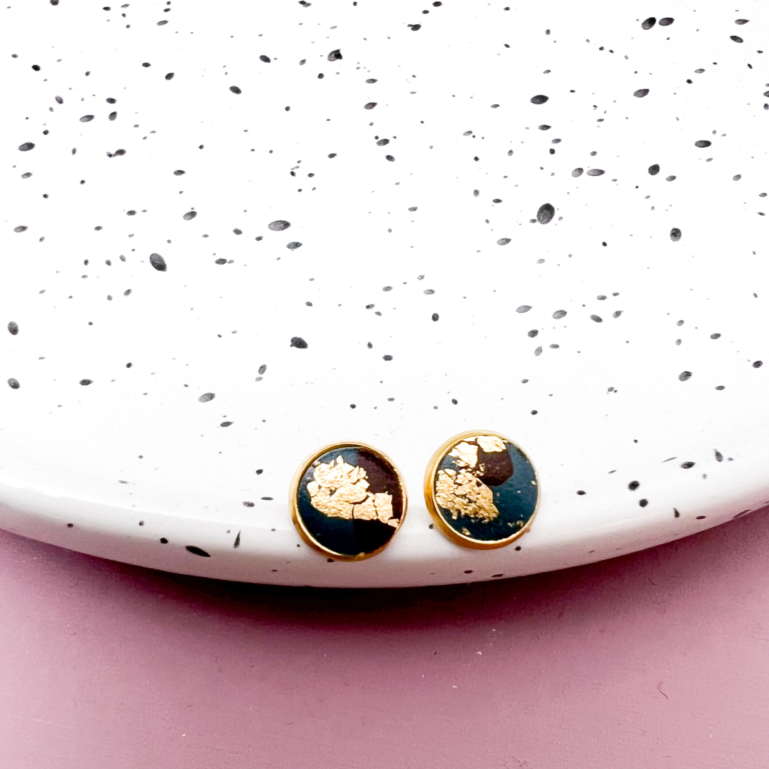 Ohrstecker in petrol und braun mit goldenen Akzenten. Die goldfarbene Fassung ist aus Edelstahl und somit auch bei empfindlicher Haut gut verträglich. Das Dekor ist aus Polymer Clay (einer ofenhärtenden Modelliermasse), lackiert mit einem matten Finish. Der Ohrstecker ist sehr leicht und angenehm zu tragen.