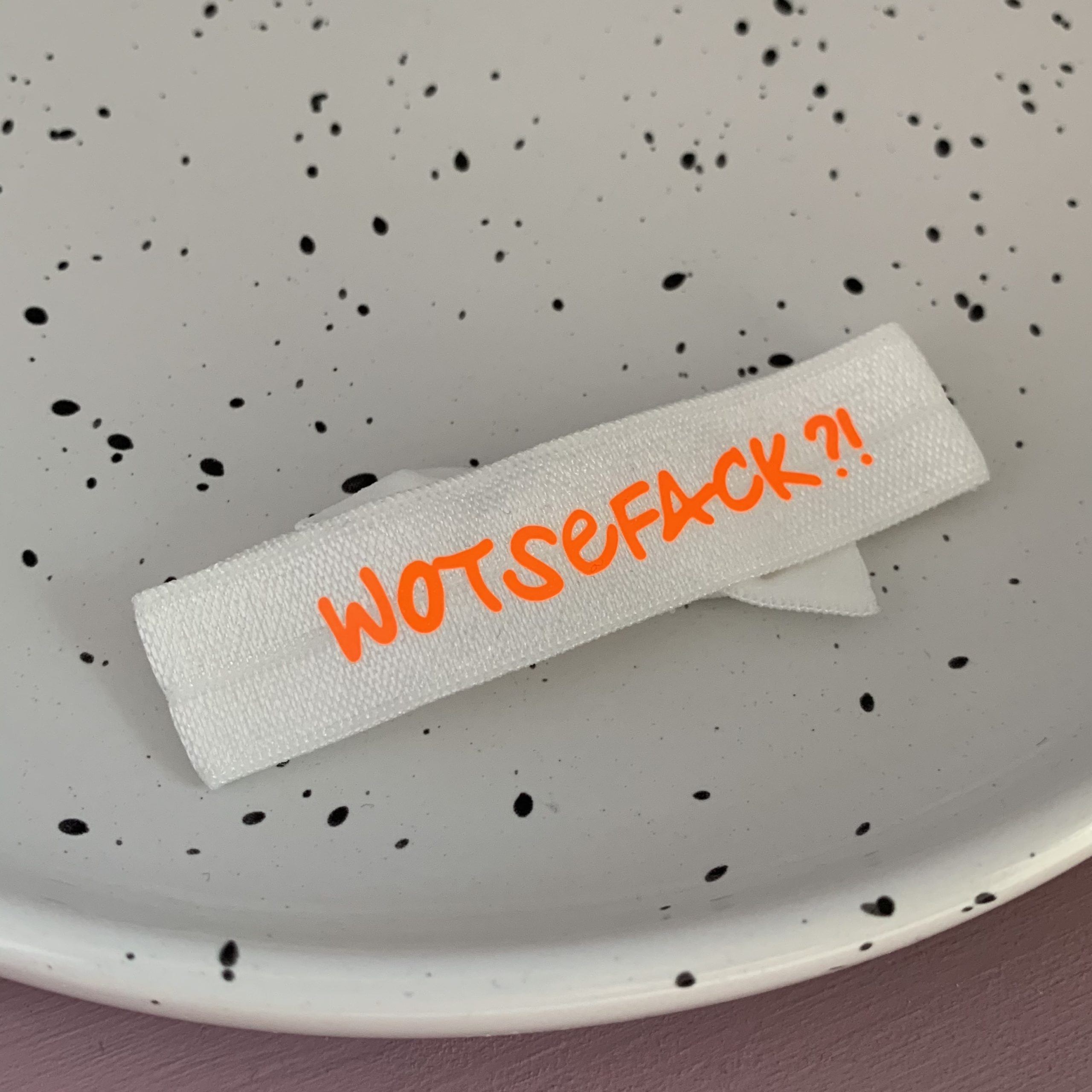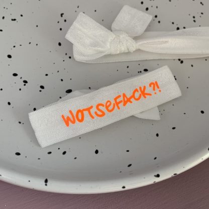 Von mir selbst geletteter WOTSEFACK?!-Schriftzug auf einem elastischen Armband. Das Armband ist auf der Rückseite geknotet und ähnelt einem Festival-Bändchen. Es kann auch als Haargummi getragen werden.